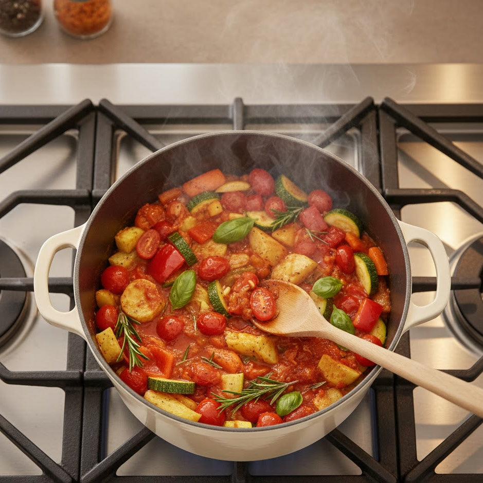 Ee recommend avoiding high heat on an empty enameled Dutch oven. Without anything inside, the enamel can heat too quickly and may become damaged over time. For best results, add a little water or oil before turning on the burner, and let your enameled Dutch oven warm up gently on low heat. This helps protect the finish and ensures beautifully even cooking every time.