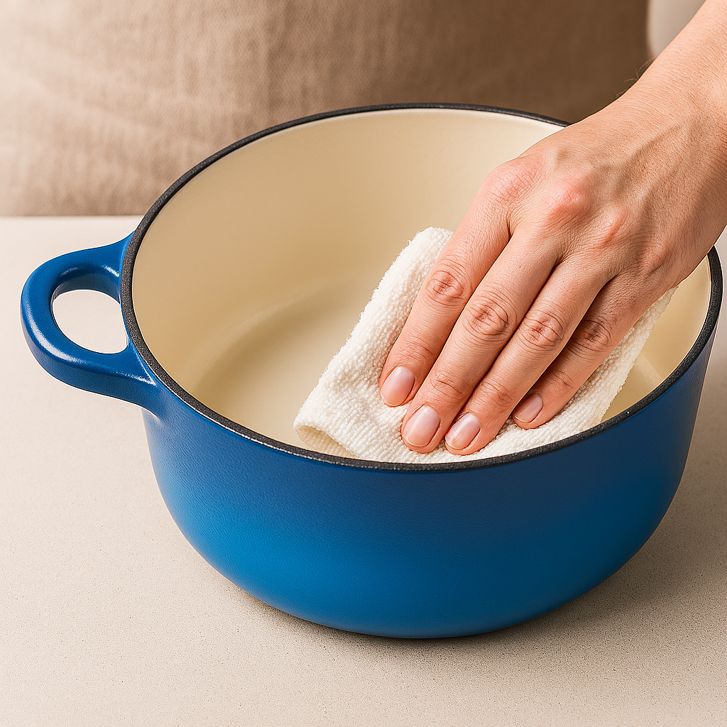After cleaning your cookware as usual, wipe the surface with a damp cloth to remove any remaining residue.