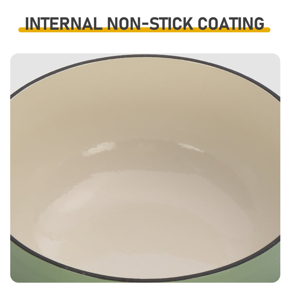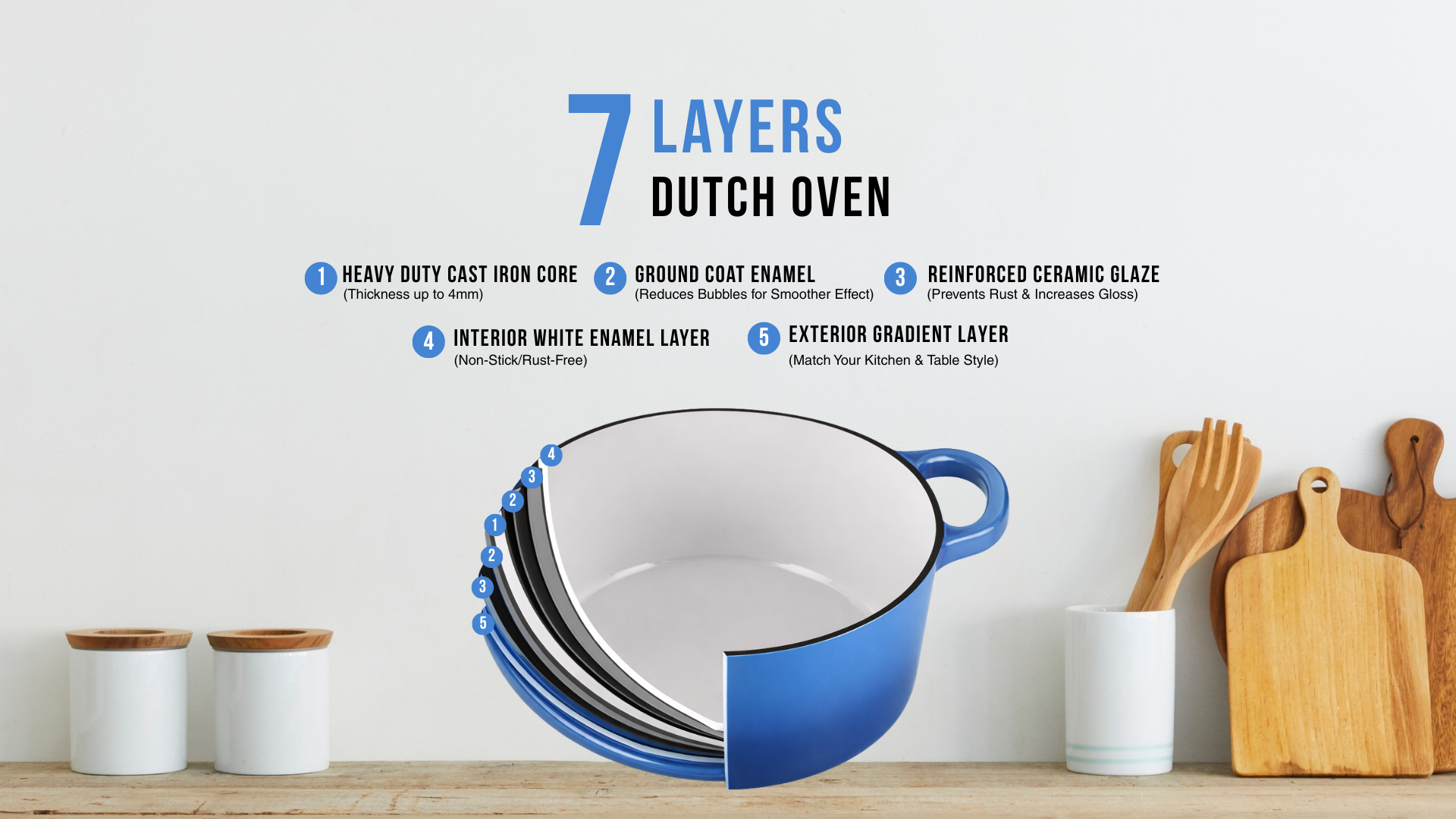 • 6 qt enameled cast iron Dutch oven • Nontoxic, non reactive enamel coating • Even heat distribution • Oven safe for up to 500°F • Compatible with all cooktops • No seasoning required